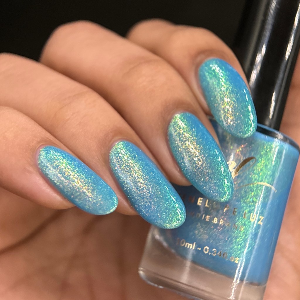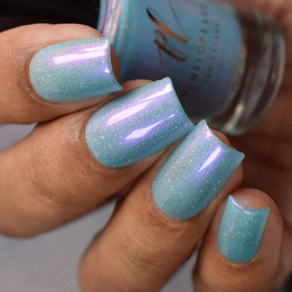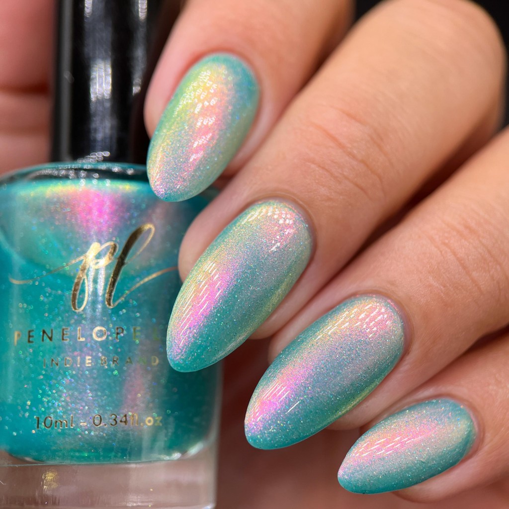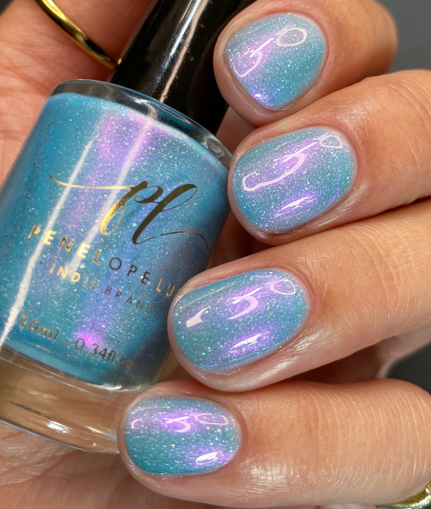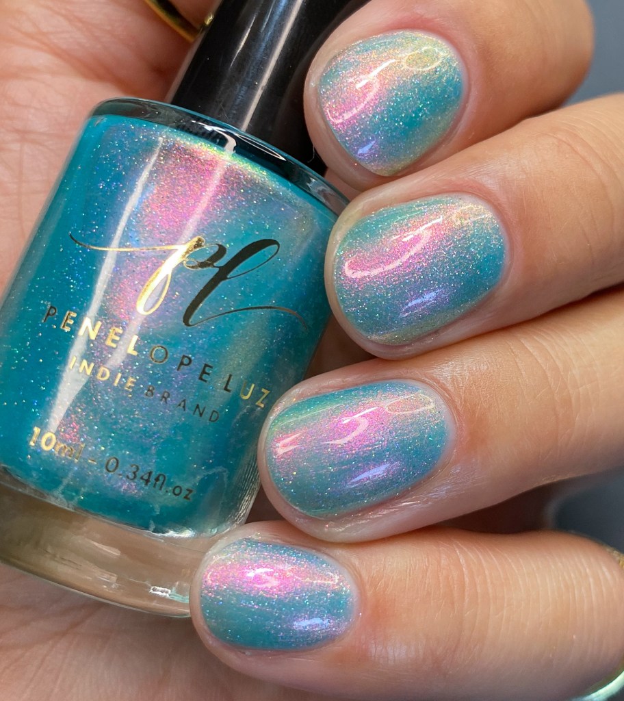 O esmalte Back in Time foi inspirado nessa nostalgia maravilhosa que é voltar nesse tempo mágico que revolucionou o mundo de tantas formas, na tecnologia, na consciencia social, na consciência ecológica, na consciencia de mais respeito e liberdade para as mulheres! Mais cor, mais brilho, mais vida para o mundo que se reconstriu depois de anos de muitas lutas. Base turquesa pastel com shimmer roxo/vermelho com um pouco de pigmento e flakie holo