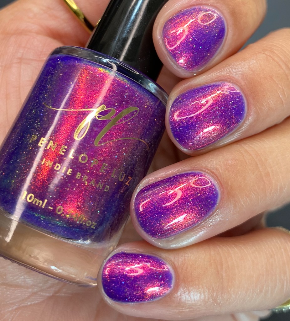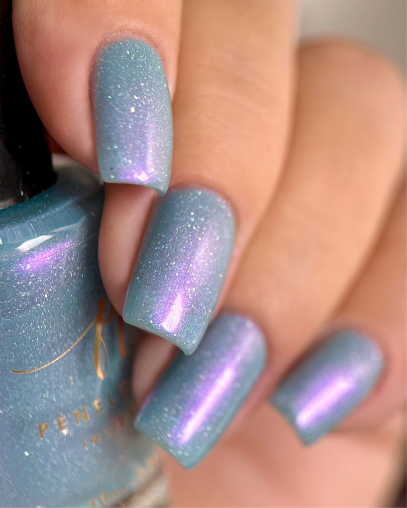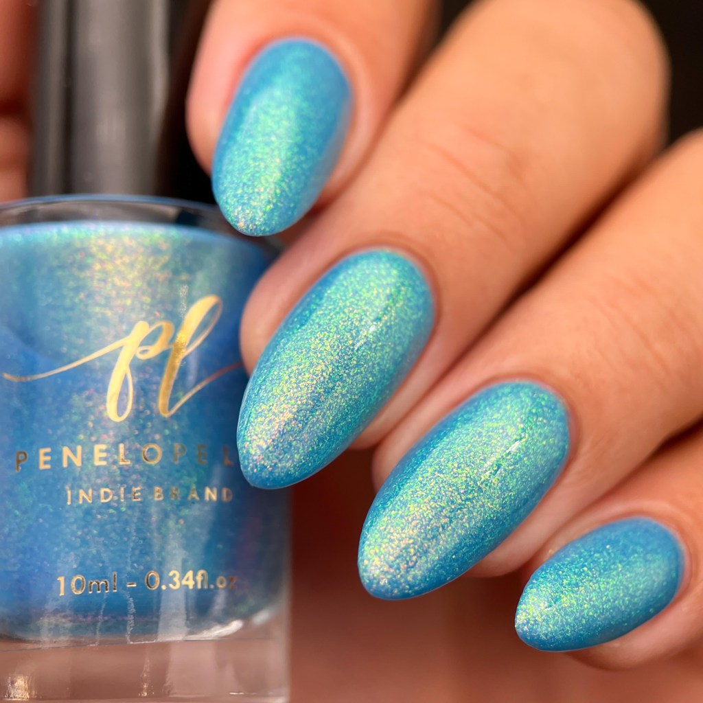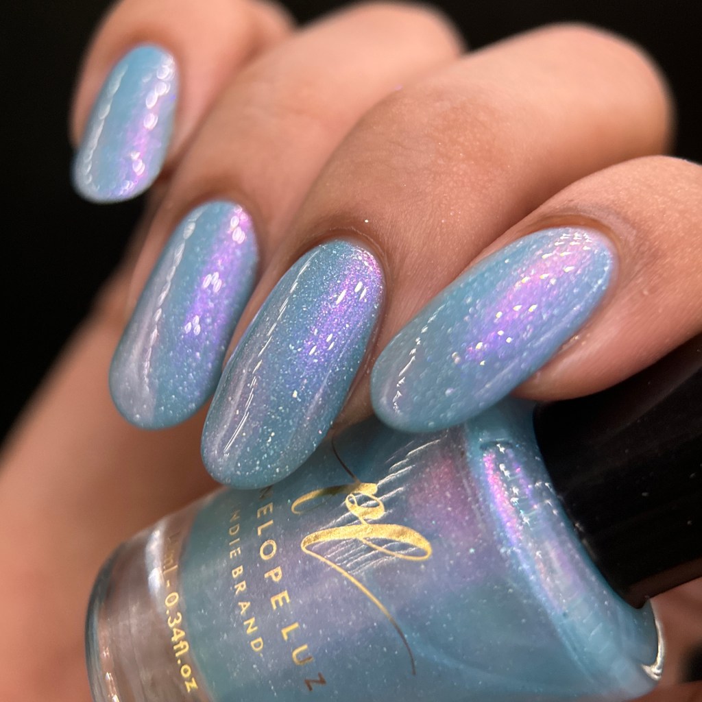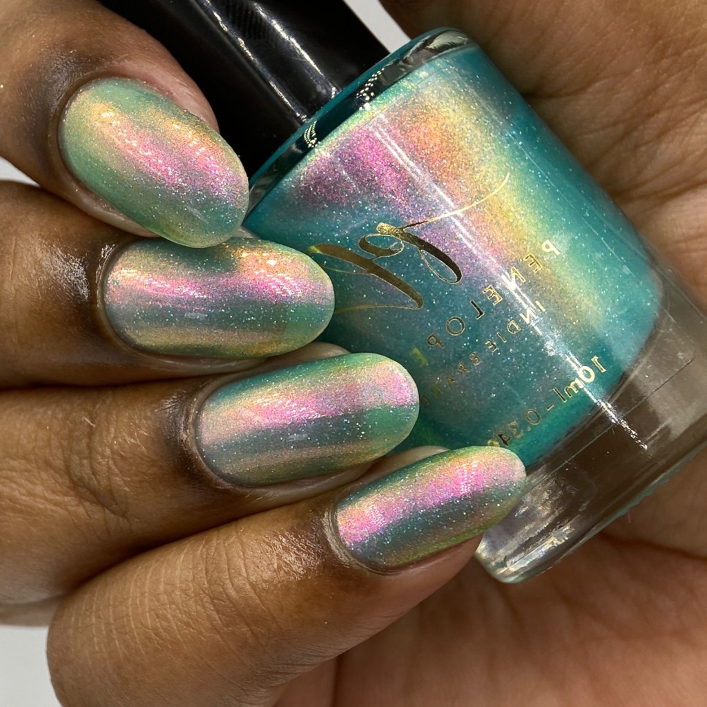 O esmalte Back in Time foi inspirado nessa nostalgia maravilhosa que é voltar nesse tempo mágico que revolucionou o mundo de tantas formas, na tecnologia, na consciencia social, na consciência ecológica, na consciencia de mais respeito e liberdade para as mulheres! Mais cor, mais brilho, mais vida para o mundo que se reconstriu depois de anos de muitas lutas. Base turquesa pastel com shimmer roxo/vermelho com um pouco de pigmento e flakie holo
