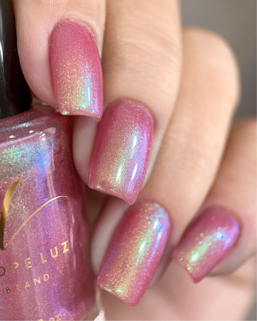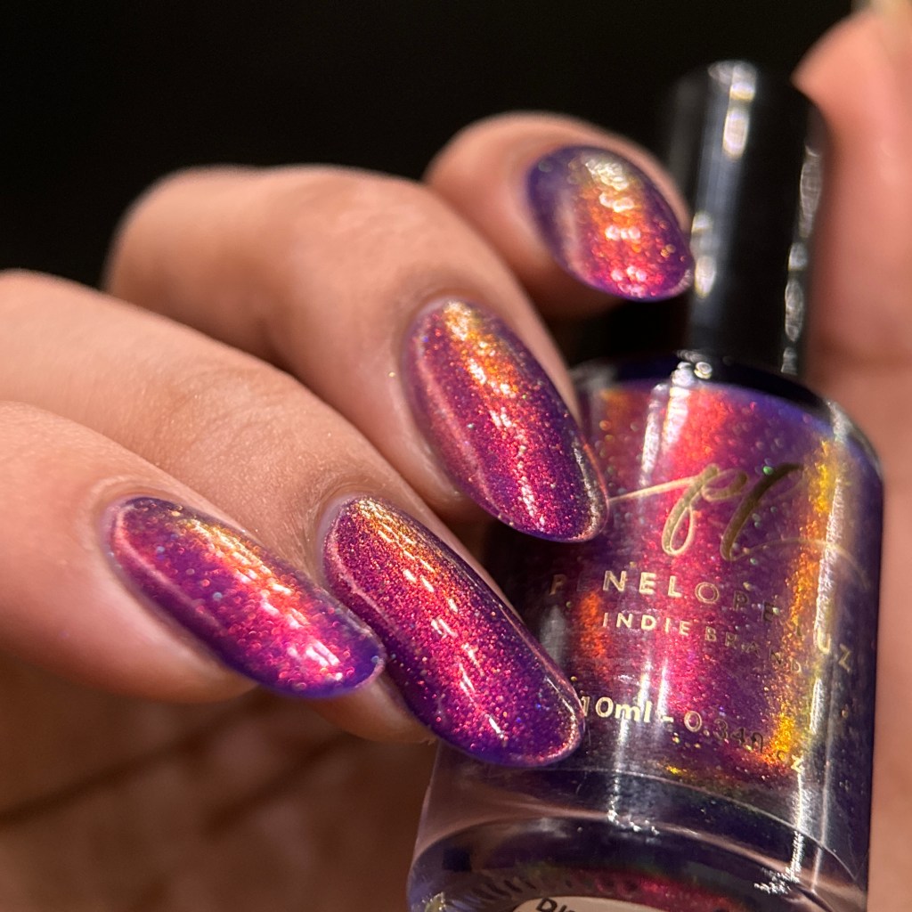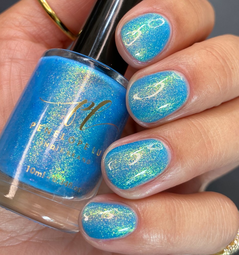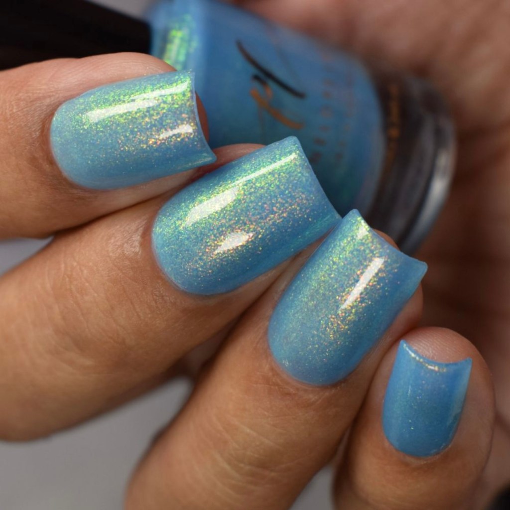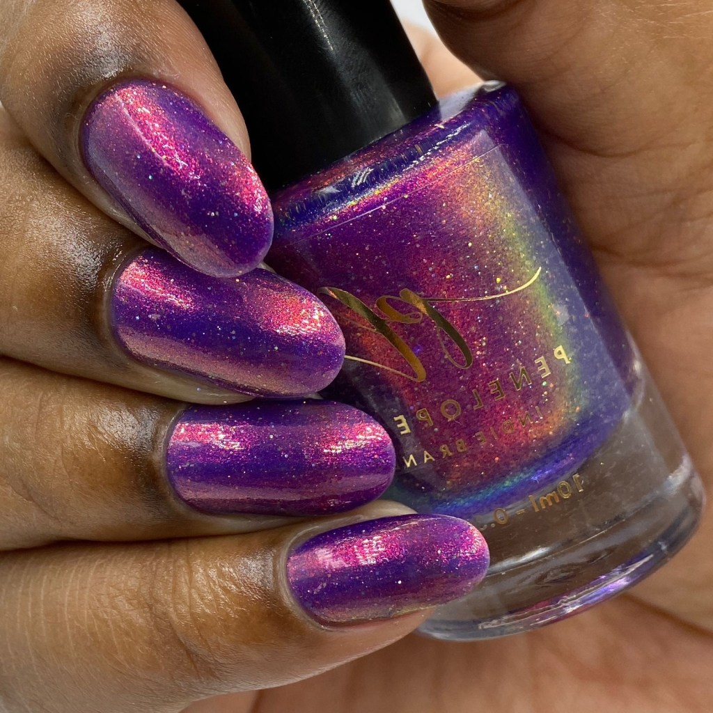 O esmalte Back in Time foi inspirado nessa nostalgia maravilhosa que é voltar nesse tempo mágico que revolucionou o mundo de tantas formas, na tecnologia, na consciencia social, na consciência ecológica, na consciencia de mais respeito e liberdade para as mulheres! Mais cor, mais brilho, mais vida para o mundo que se reconstriu depois de anos de muitas lutas. Base turquesa pastel com shimmer roxo/vermelho com um pouco de pigmento e flakie holo