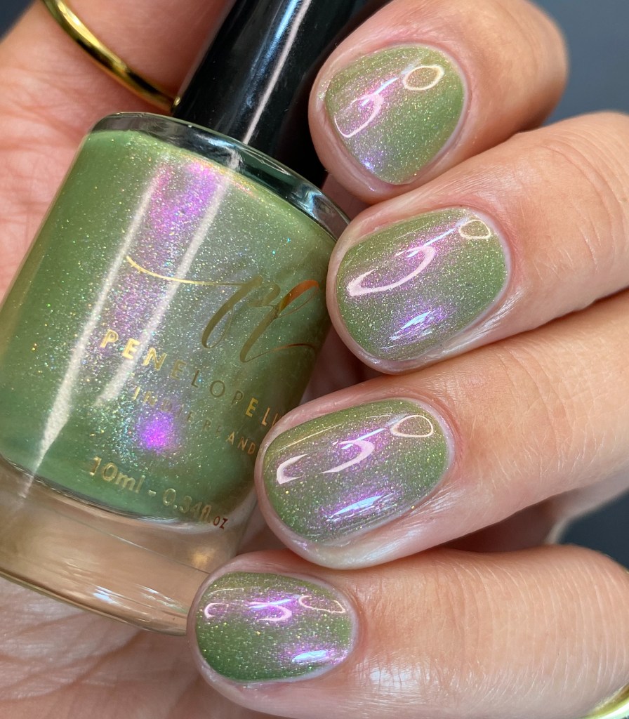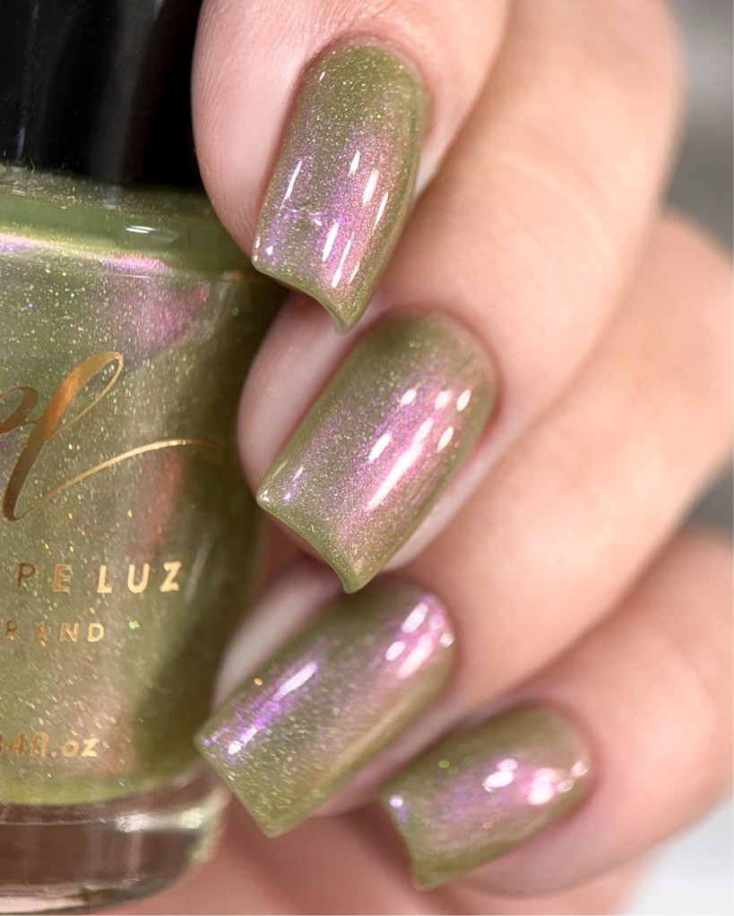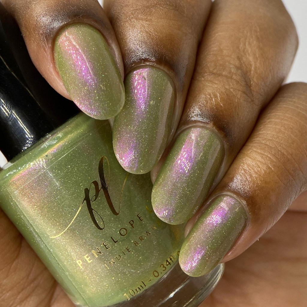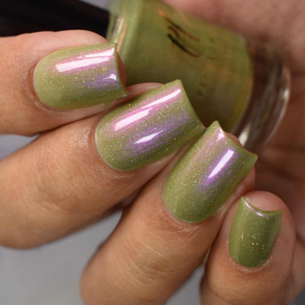O esmalte Groovy Green foi inspirado no surgimento da preocupação com a ecologia, com o planeta, com festas em florestas, hippies curtindo a natureza sobre um chão de gramas, árvores e natureza em volta. Base crealy verde oliva com shimmer roxo/vermelho e um pouco de pigmento e flake holográfico.
