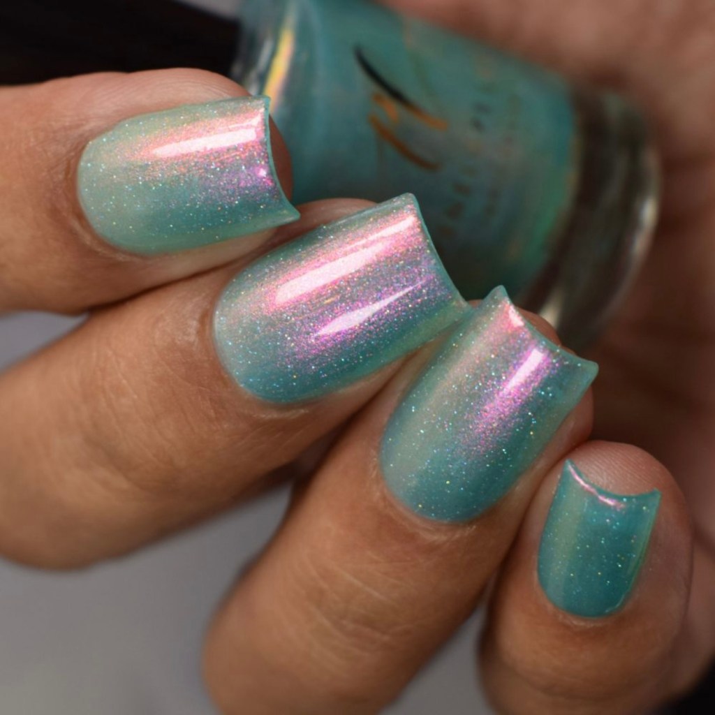 O esmalte Mod Mint foi inspirado nessa cor tão linda e que esteve muito em alta nos anos 60, quando tons pasteis tomavam conta do mundo. Mas é claro que o nosso menta é cheio de emoção! Base verde menta com aurora rosa/vermelho/dourado/verde