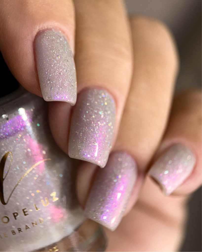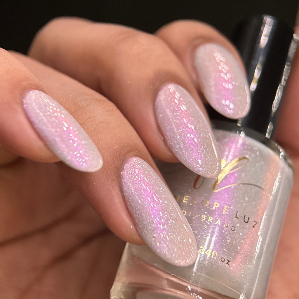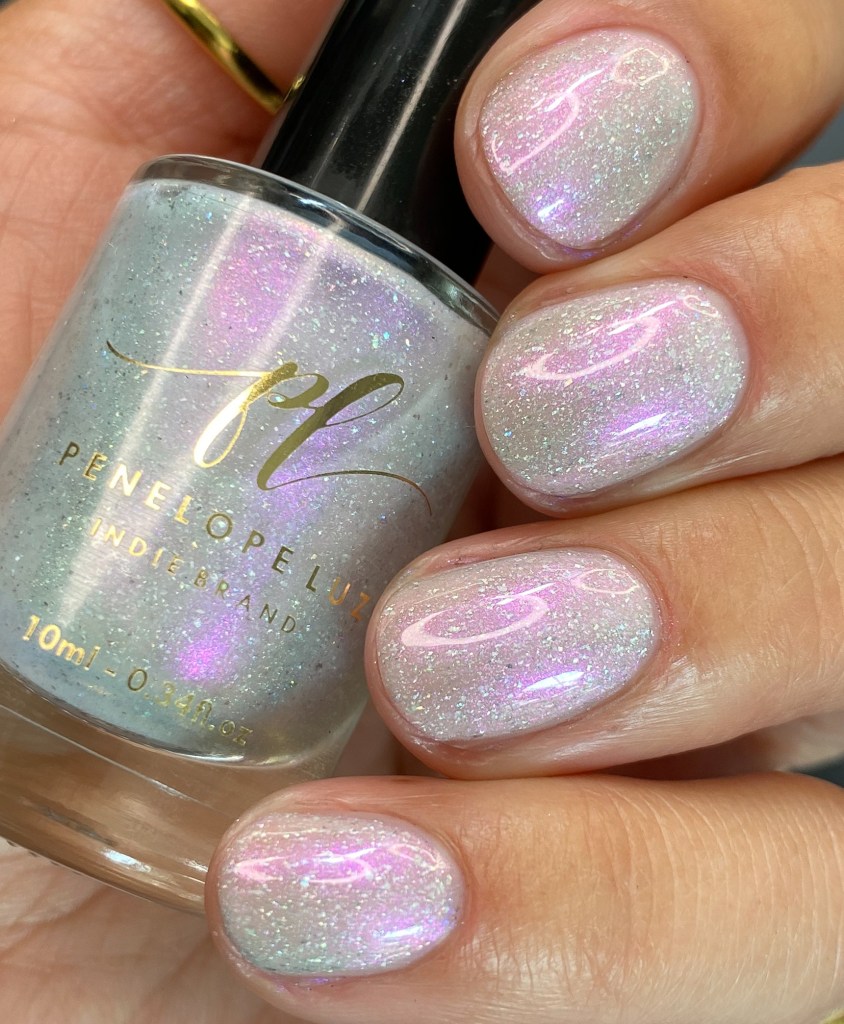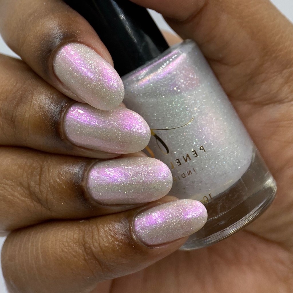 O esmalte Peace & Love foi inspirado num momento que o mundo buscava a paz, o amor, logo após muitas guerras que deixaram o mundo muito frágil, esse movimento acabou chamando a atenção e contagiando muitas pessoas para o bem. Base crealy branca com shimmer roxo/vermelho e um pouco de pigmento e flake holográfico.