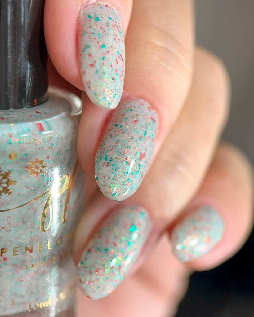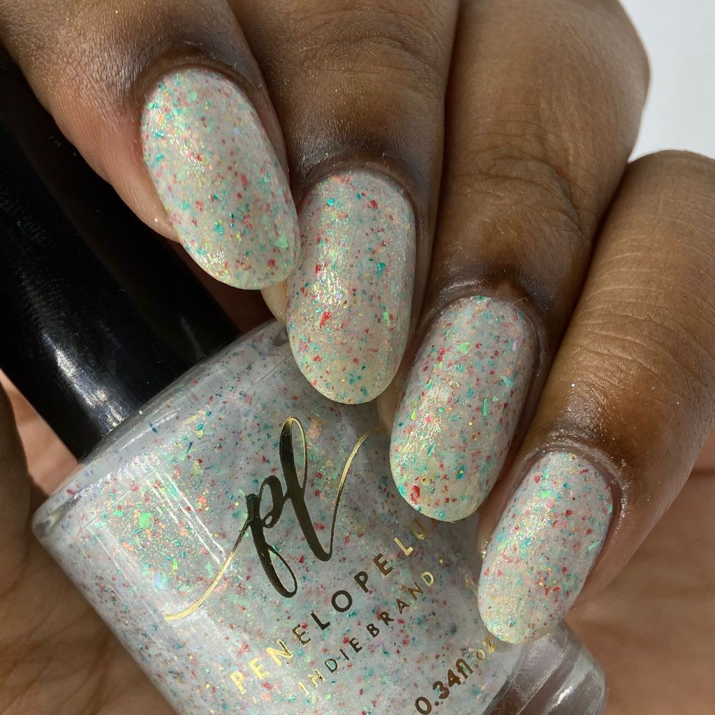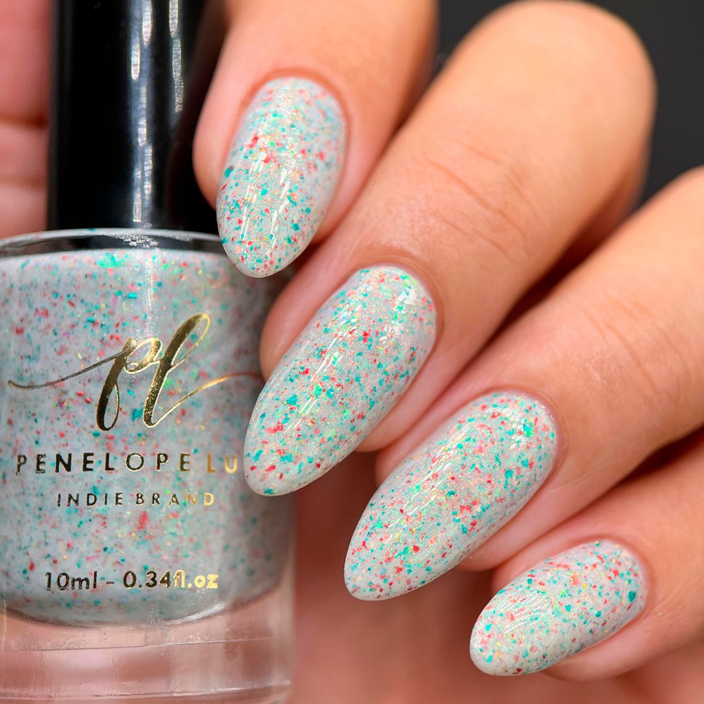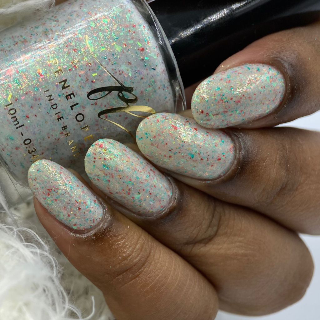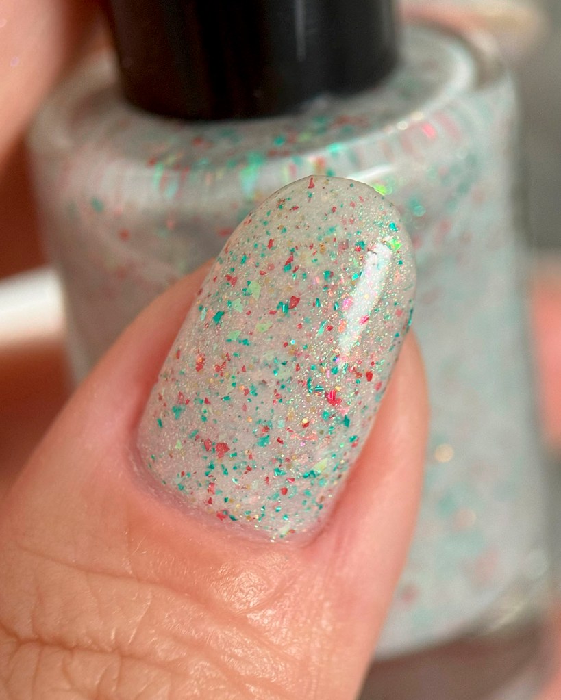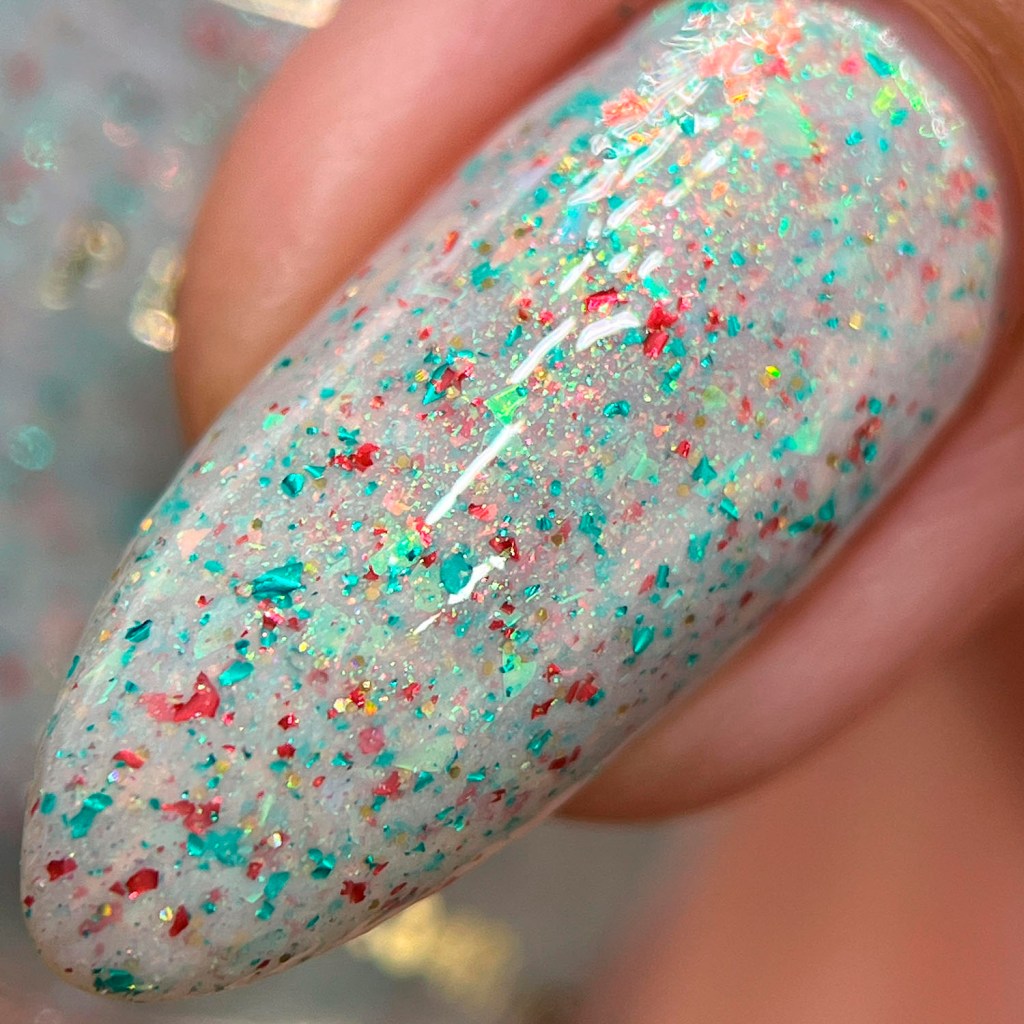 Primeiro vamos ao Angelic Light, um flake que é a cara do Natal, branquinho crealy com micro flakes nas cores vermelho e verde e também flakes iridescentes vermelho e verde, com um pouquinho de glitter holo dourado pra brilhar ❤
