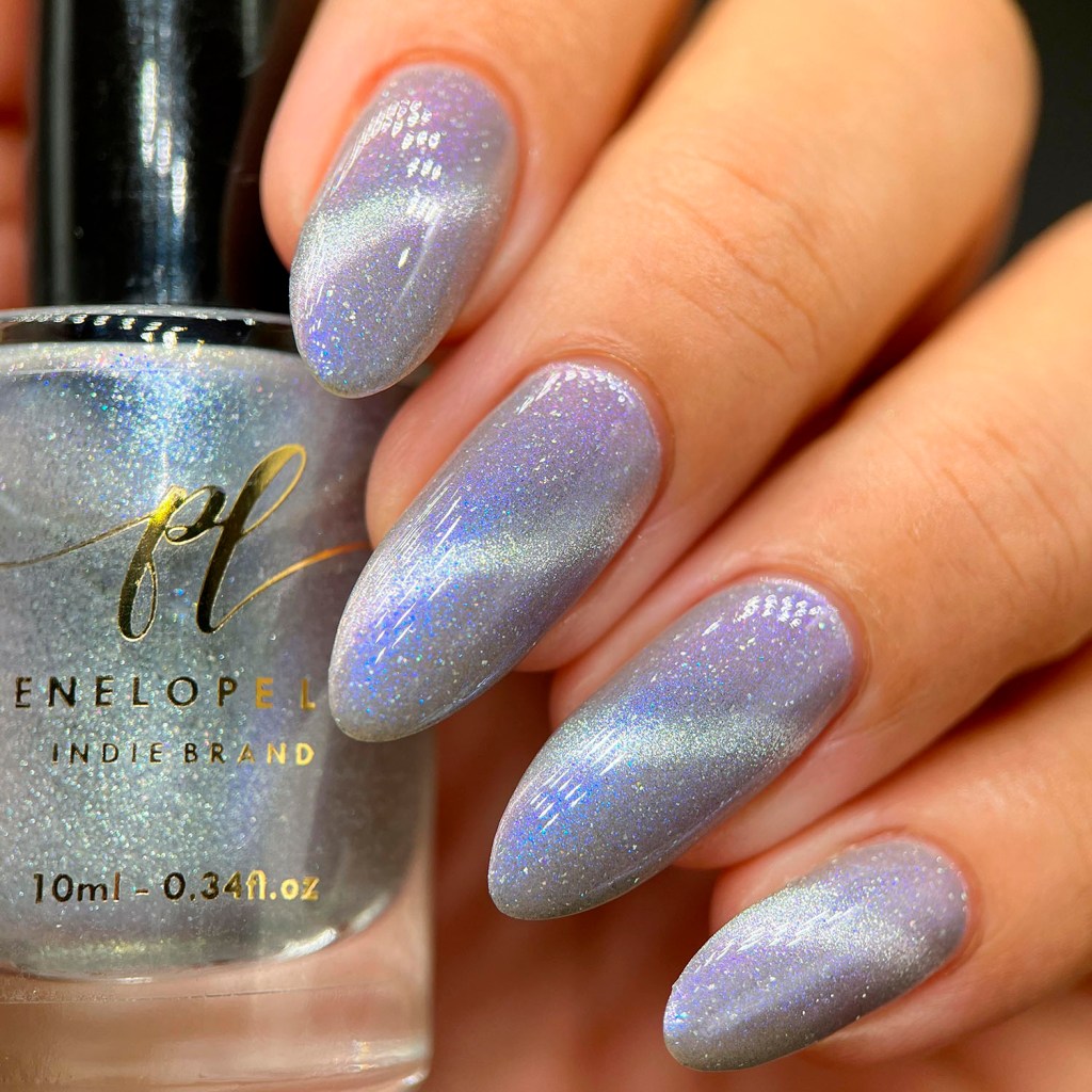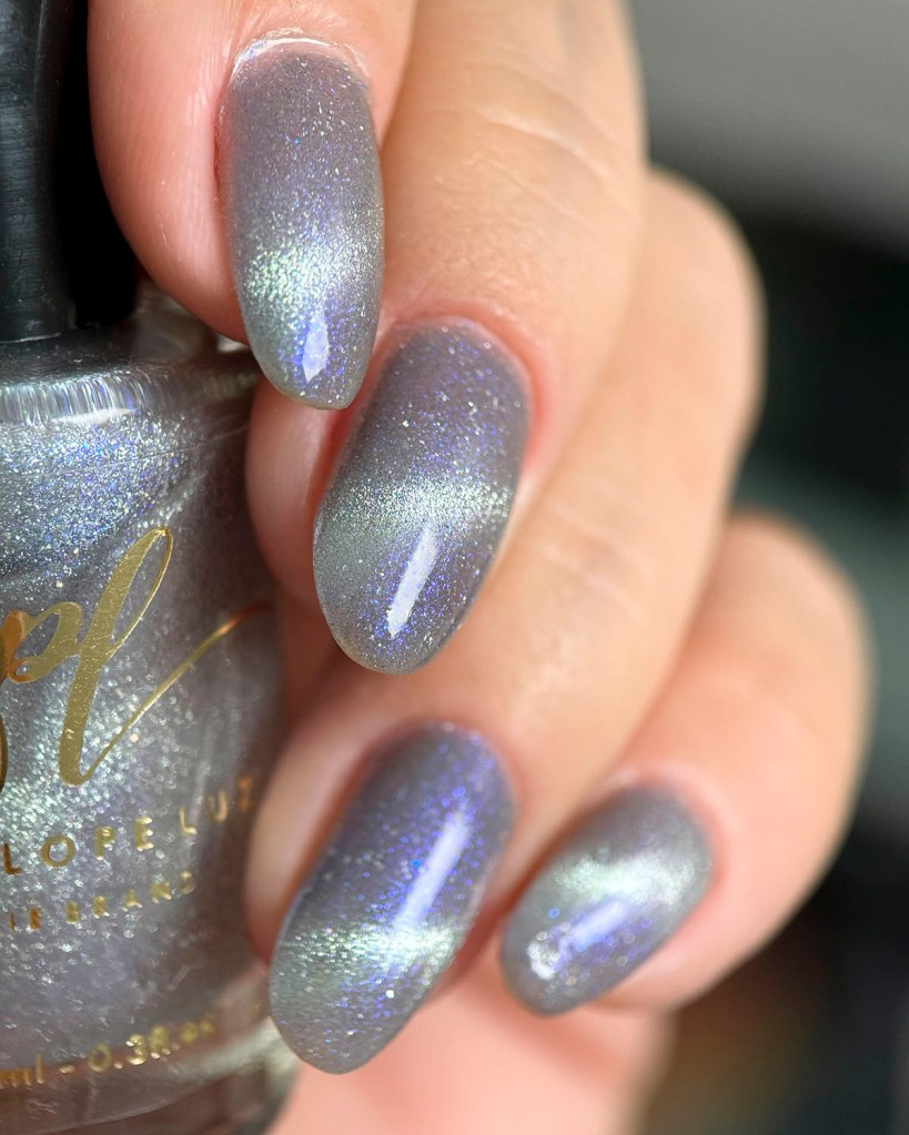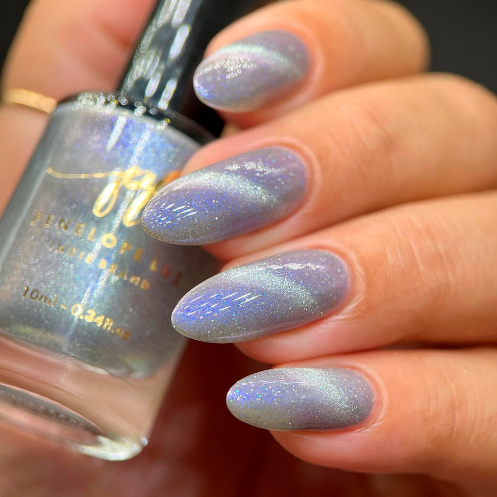 Agora vamos ao Angel’s Whisper, que é um magnético prata com fundo cinza clarinho e shimmer azul, bem delicado! Um suspiro de anjo mesmo! ❤