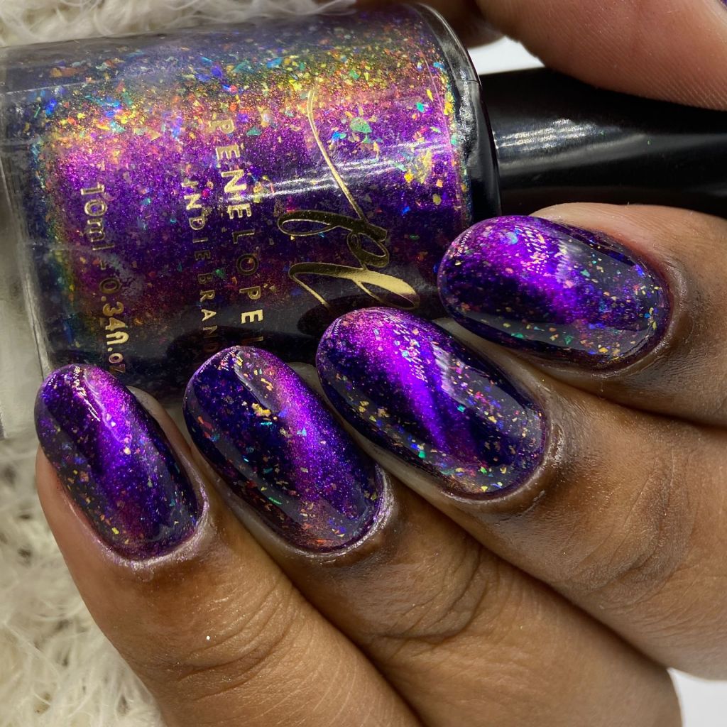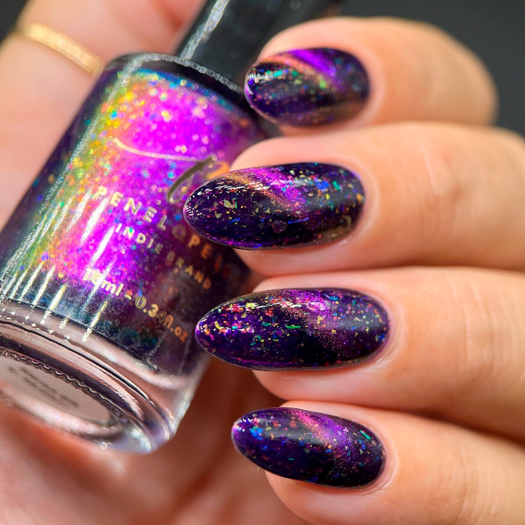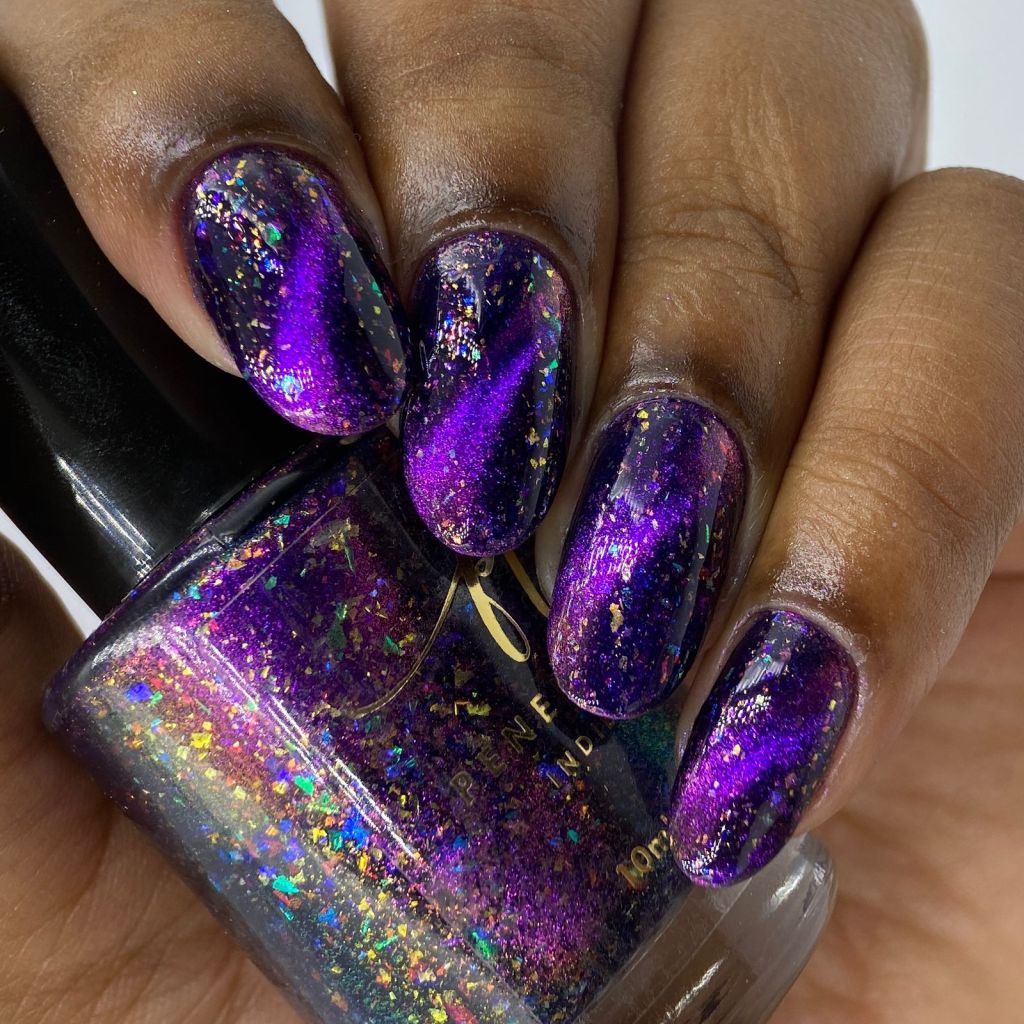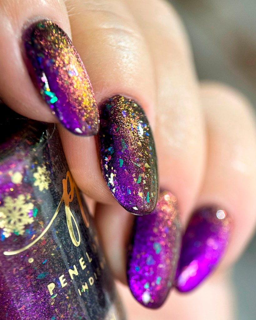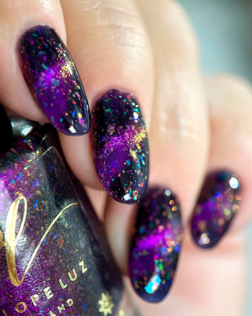 Agora vamos ao Glorius Gift, porque gente, esse esmalte é mesmo glorioso! Todo colorido como muitas luzinhas de Natal nas unhas, um espetáculo! Ele é um magnético roxo/dourado com flakes multicoloridos.
