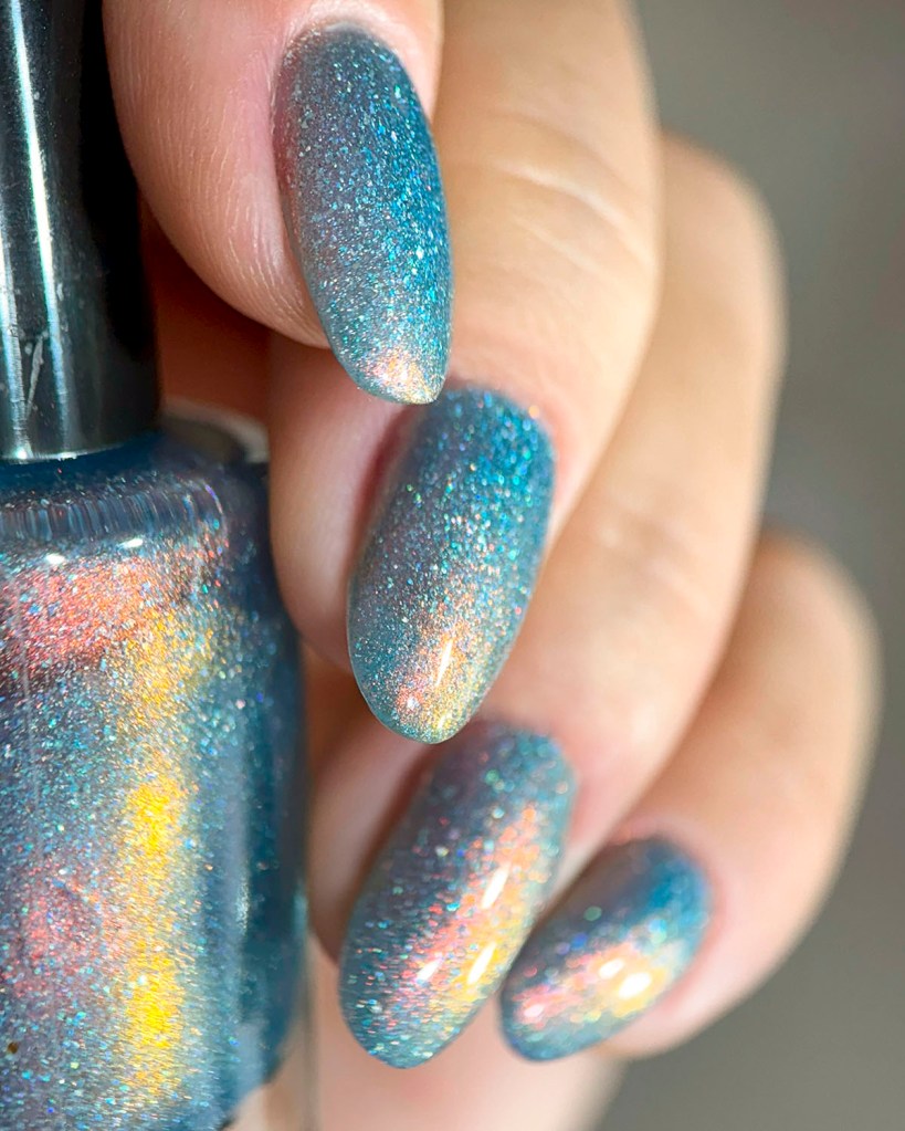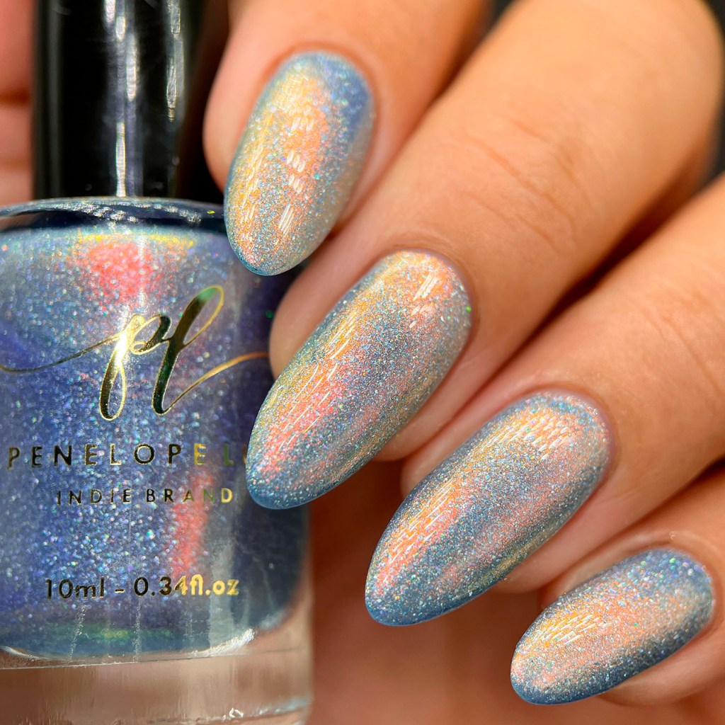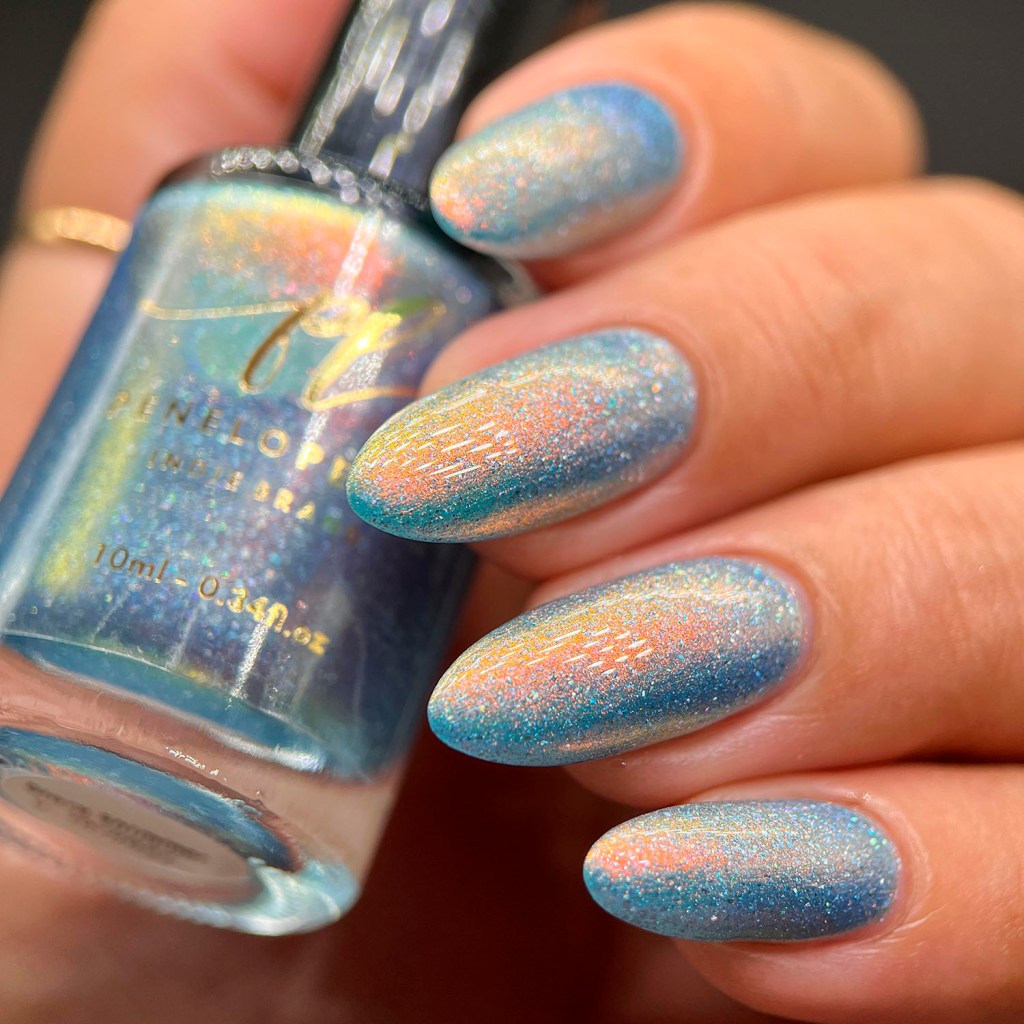Agora vamos ao Glory Shimmer, outro que é puro escândalo, ele é um azul bebê com holo, flake holo e shimmer aurora intenso laranja/dourado.