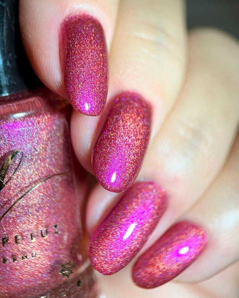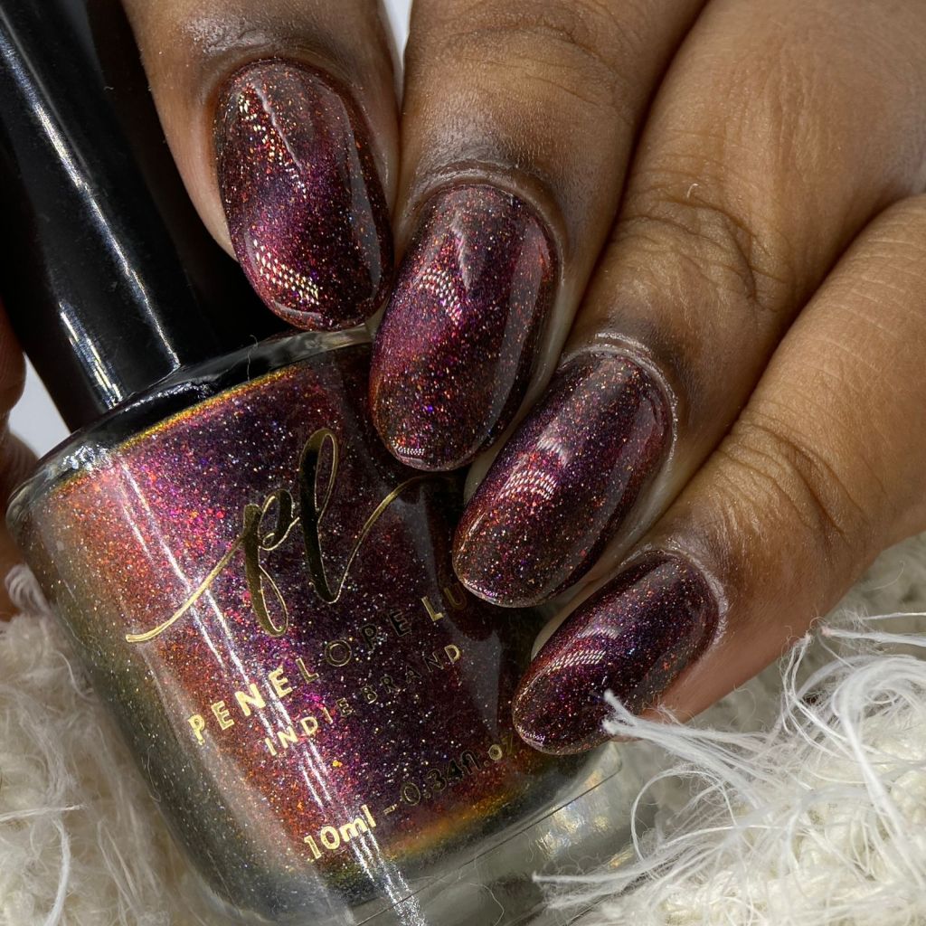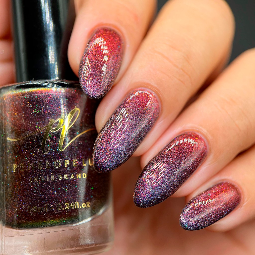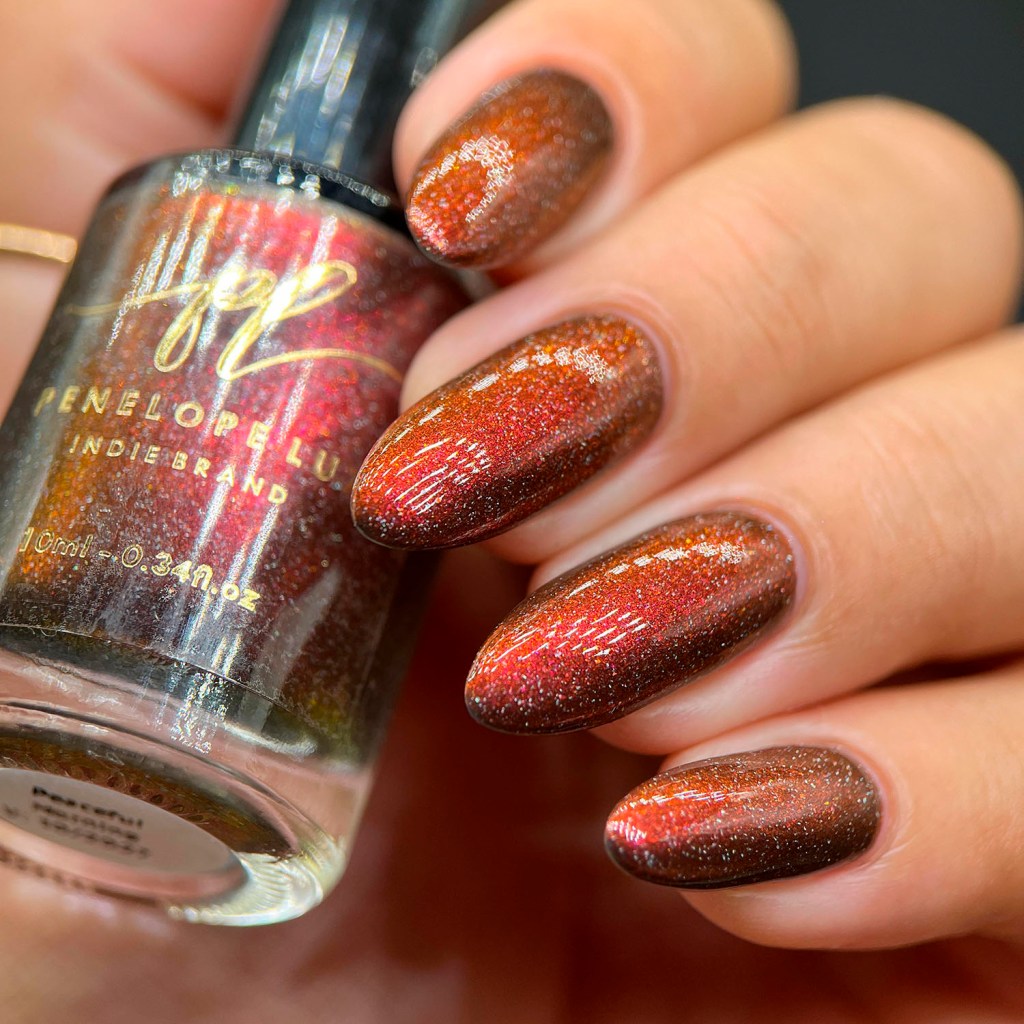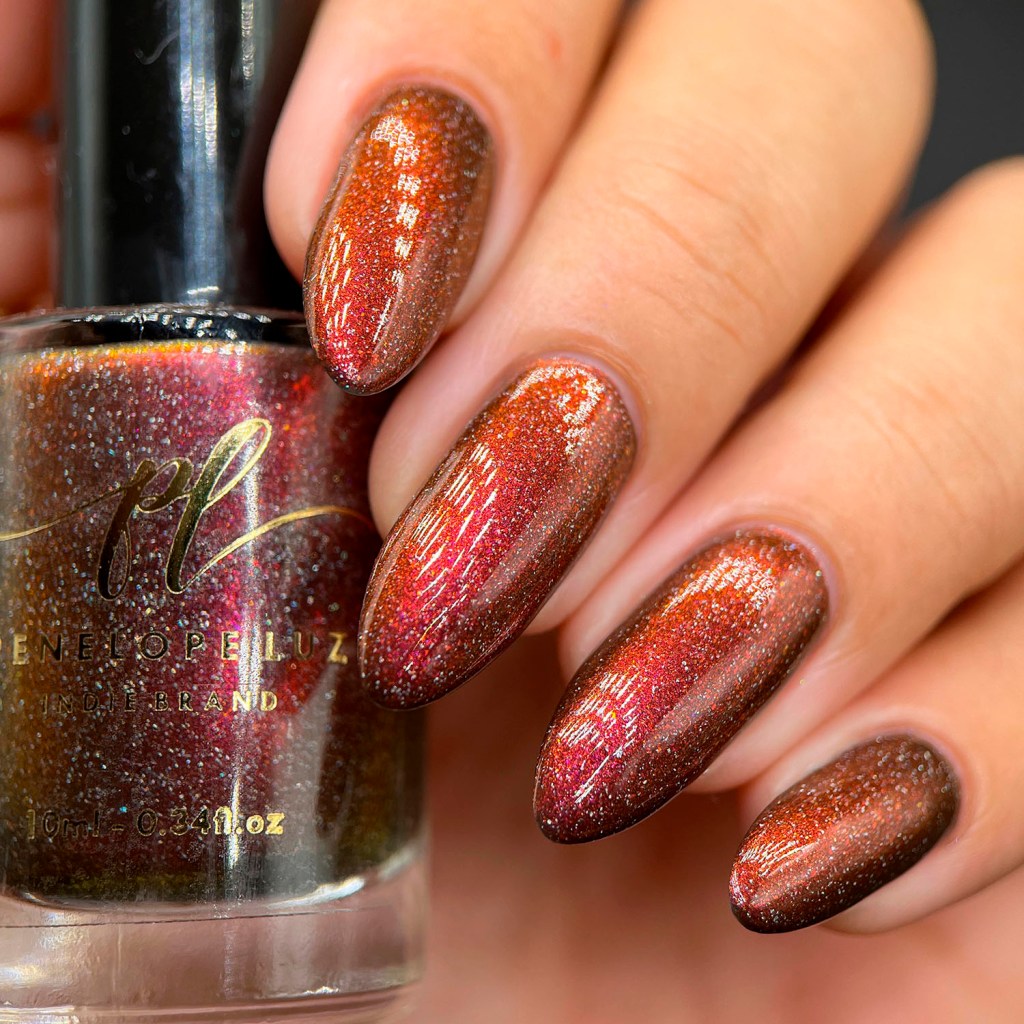 Agora vamos ao segundo vermelho da coleção, o Peaceful Morning, dessa vez um vermelho sangue, com fundo preto, micro flake vermelho puxando pro marrom e shimmer com tons de laranja e dourado, e glitter holo prata! Escandaloso e elegante!