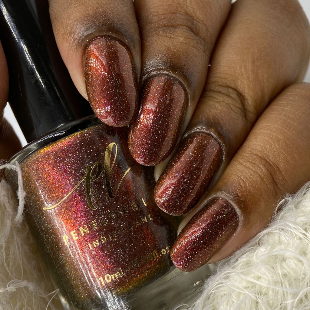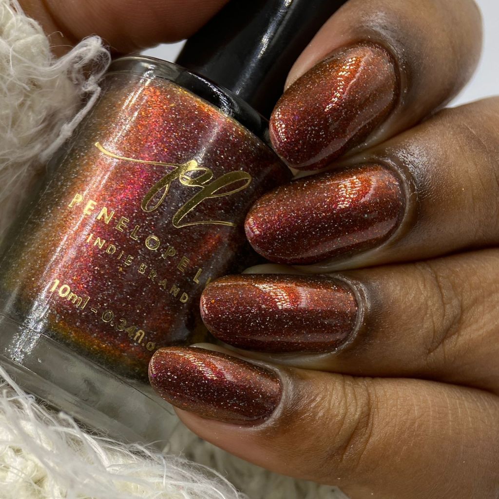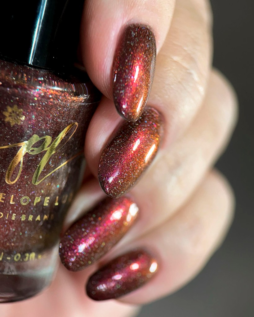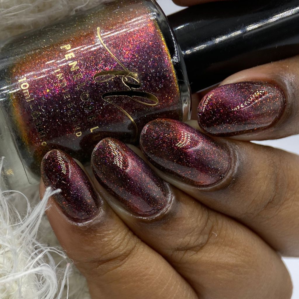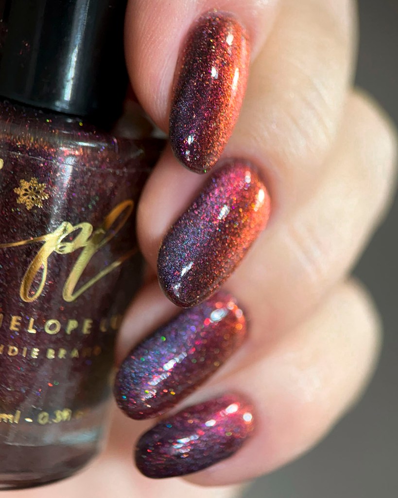 Agora vamos ao segundo vermelho da coleção, o Peaceful Morning, dessa vez um vermelho sangue, com fundo preto, micro flake vermelho puxando pro marrom e shimmer com tons de laranja e dourado, e glitter holo prata! Escandaloso e elegante!