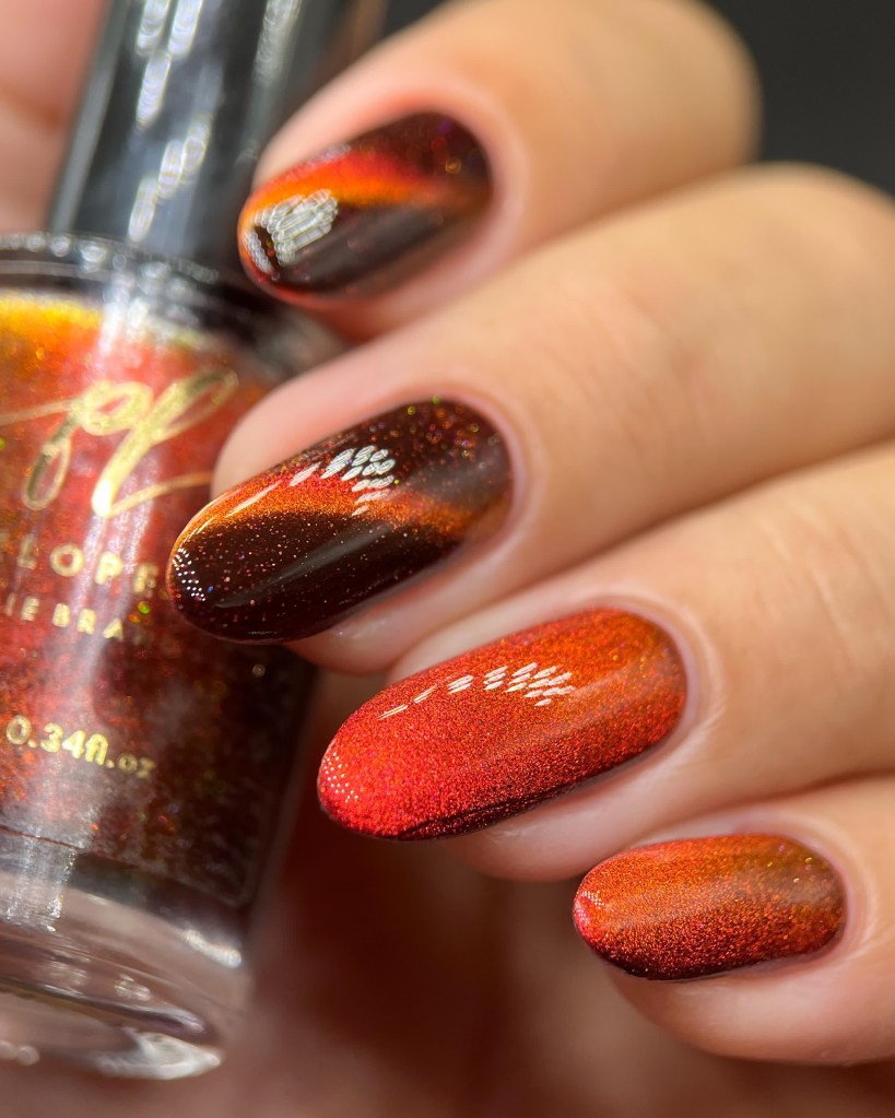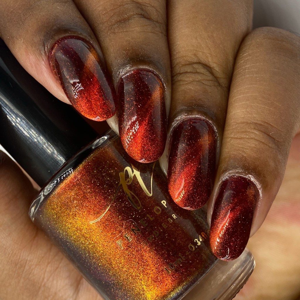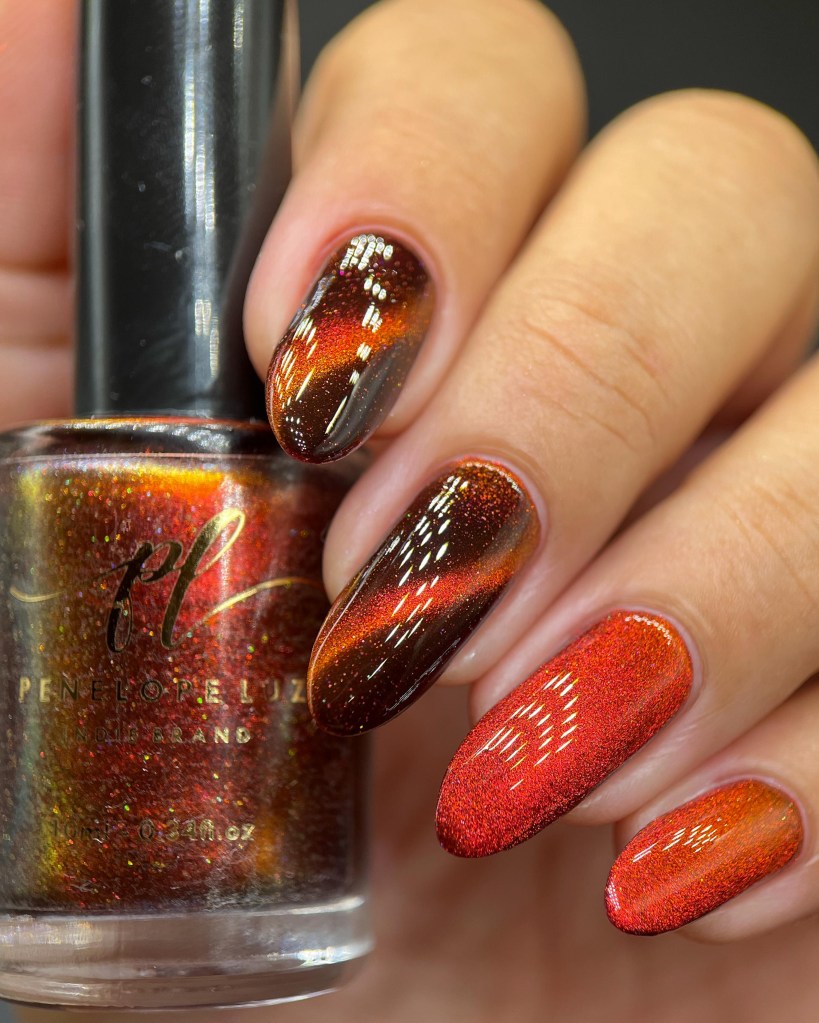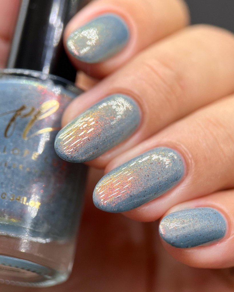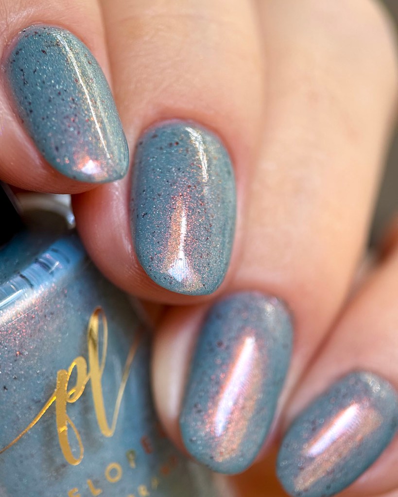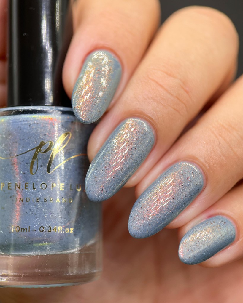 Agora vamos ao Stillness, azul acinzentado com shimmer laranja e micro flakes preto/vermelho, inspirado quietude que precisamos buscar na nossa mente para chegarmos a tranquilidade da alma.
