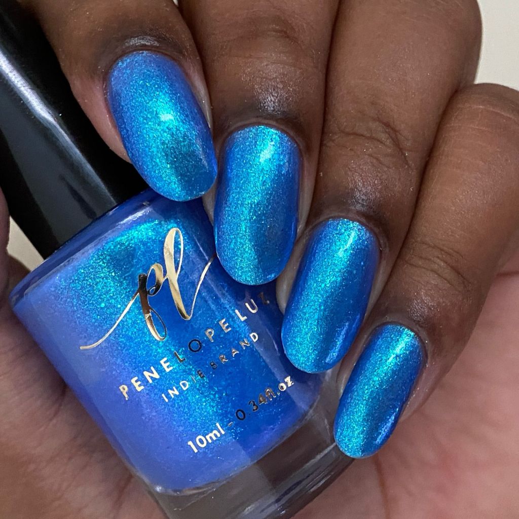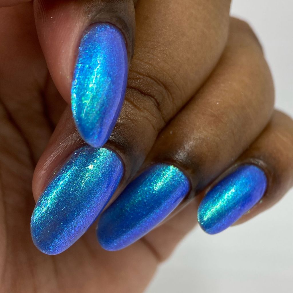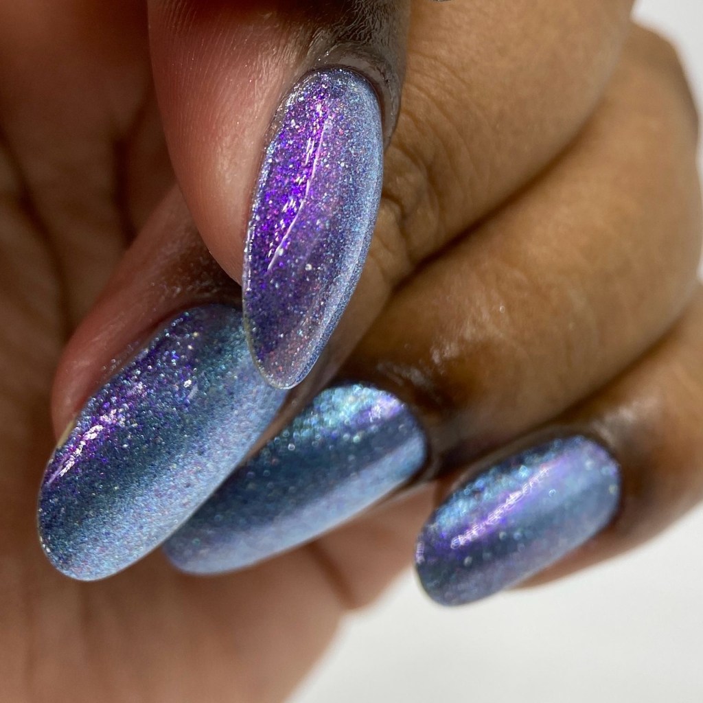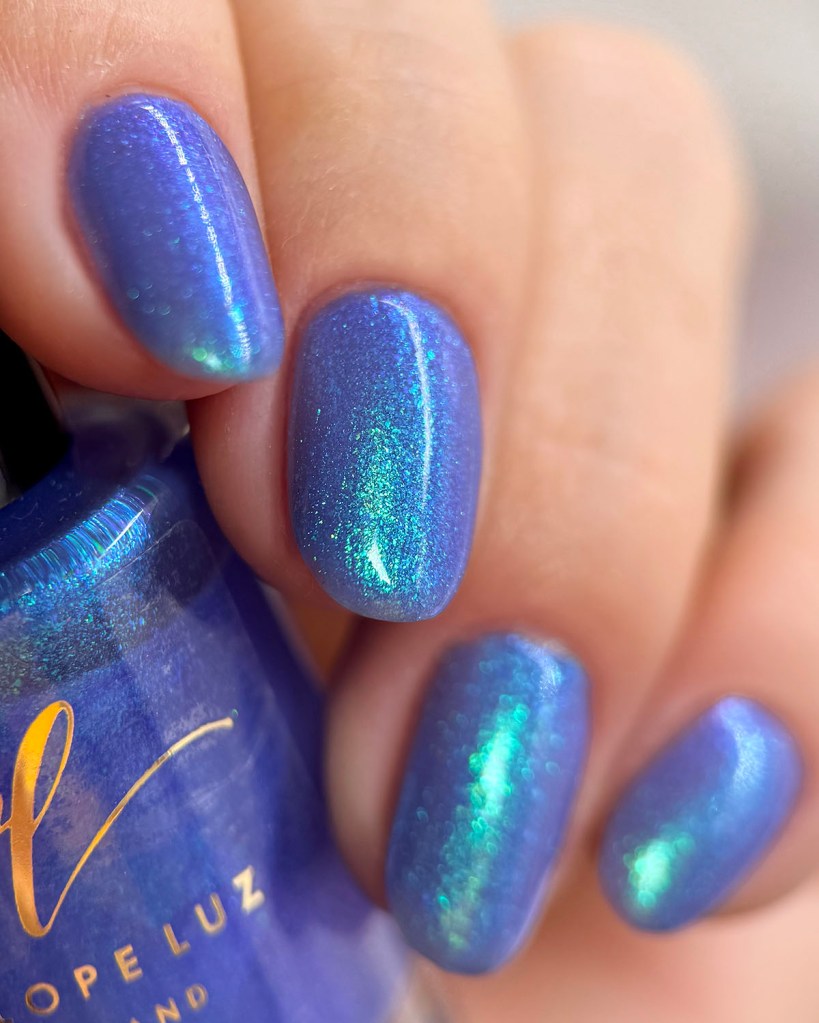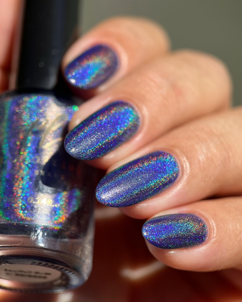 Agora vamos ao Soulfull Hues, holográfico azul marinho com intenso prisma holo, inspirado nas cores que nossa alma exala e chamamos de aura.