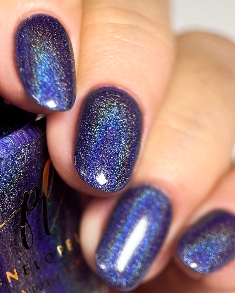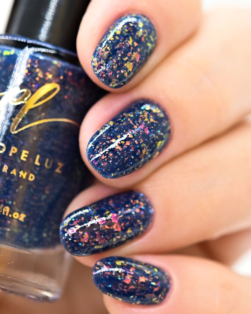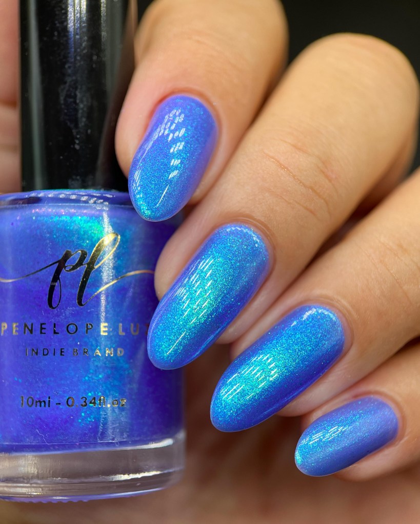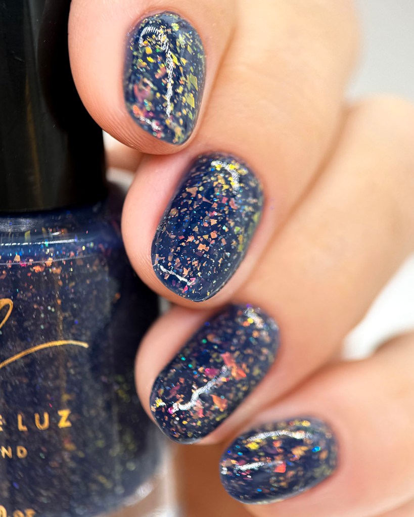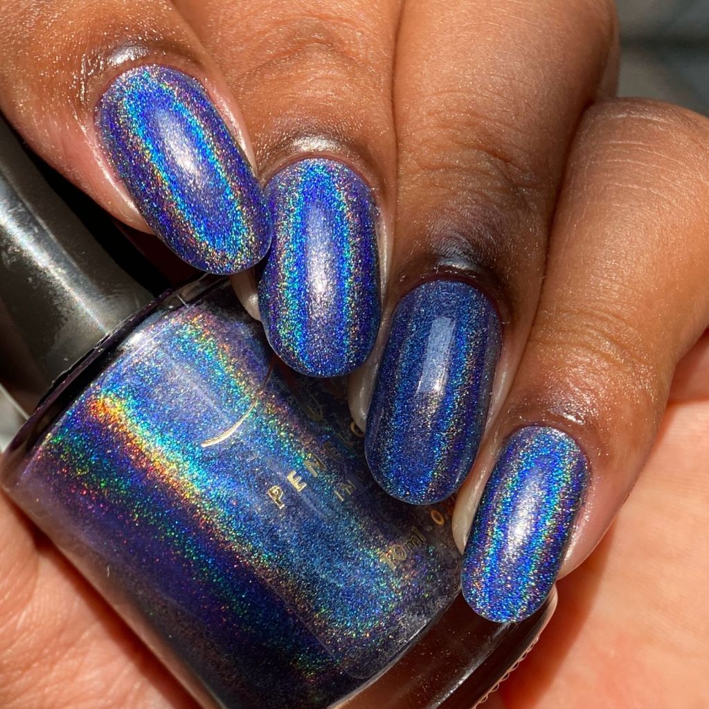 Agora vamos ao Soulfull Hues, holográfico azul marinho com intenso prisma holo, inspirado nas cores que nossa alma exala e chamamos de aura.
