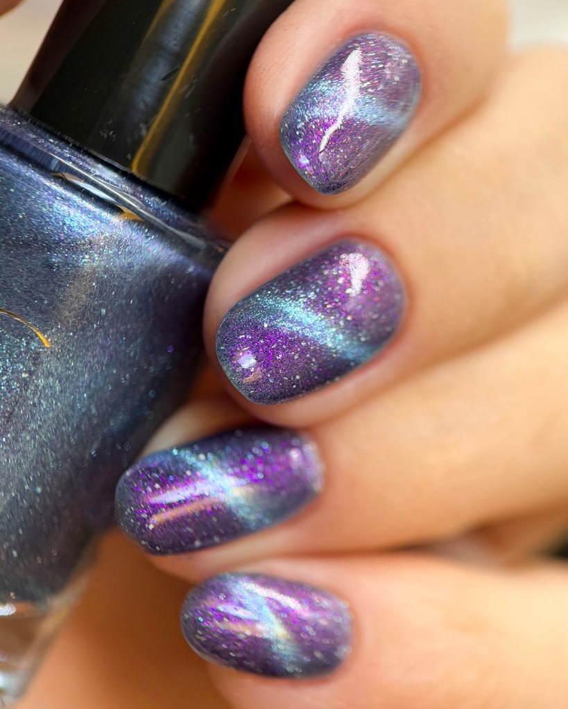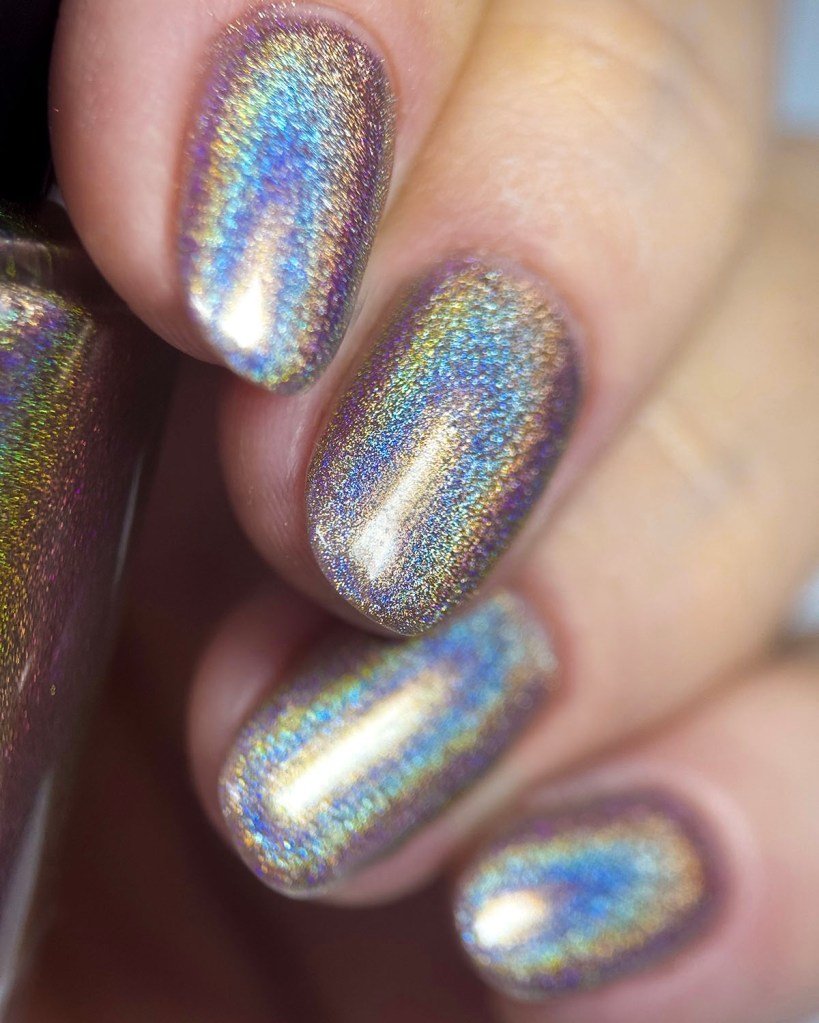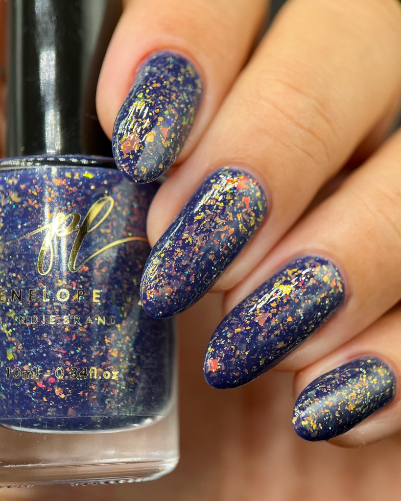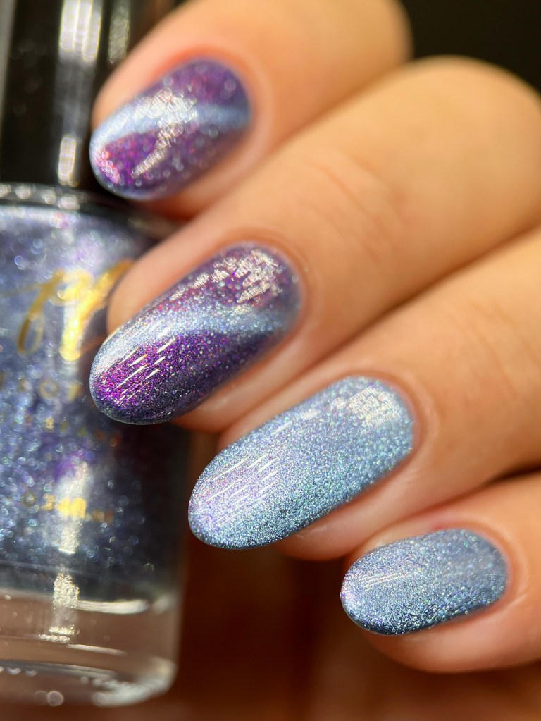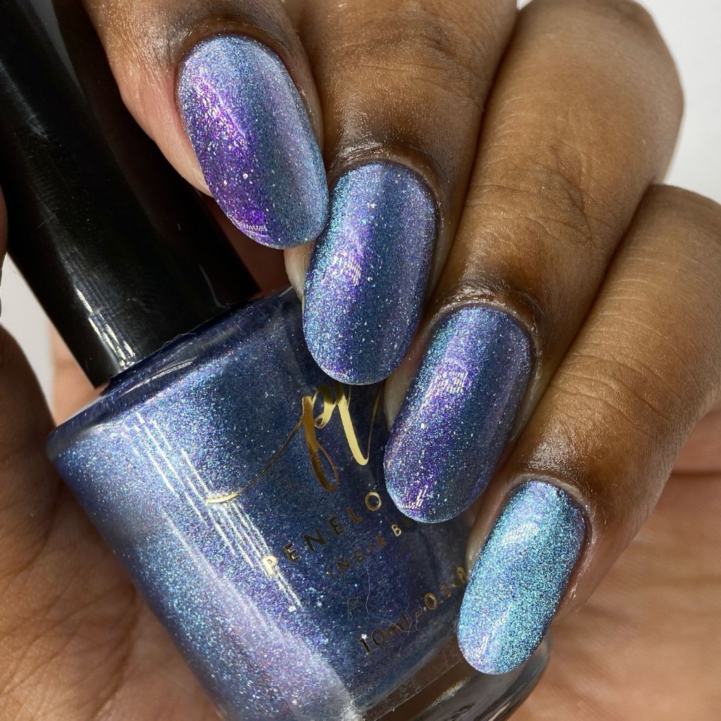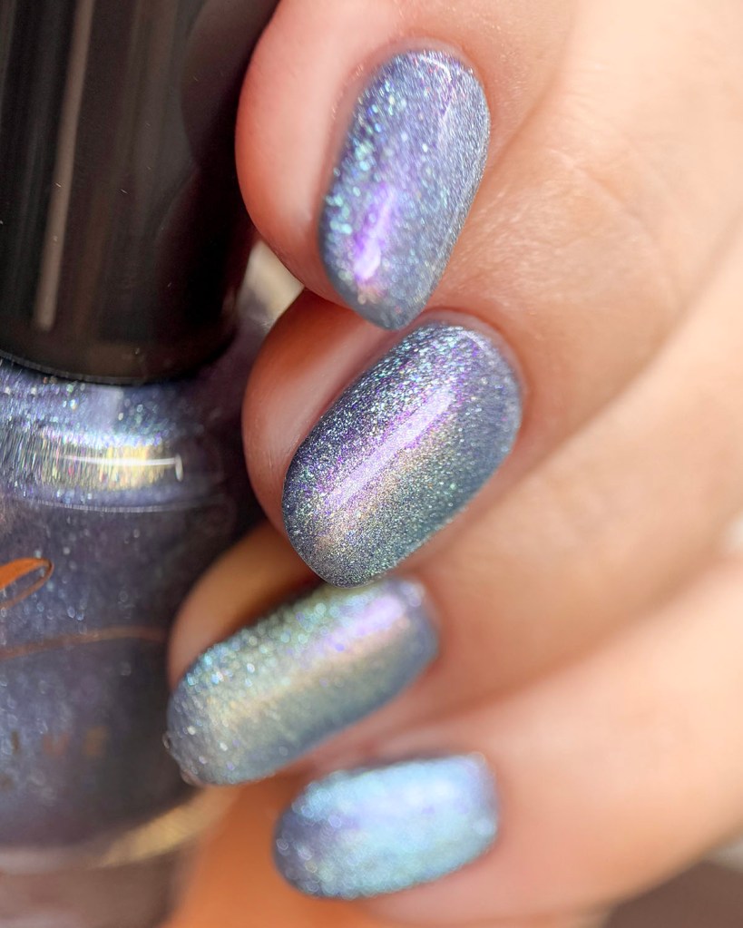 Agora vamos ao Soulfull Hues, holográfico azul marinho com intenso prisma holo, inspirado nas cores que nossa alma exala e chamamos de aura.