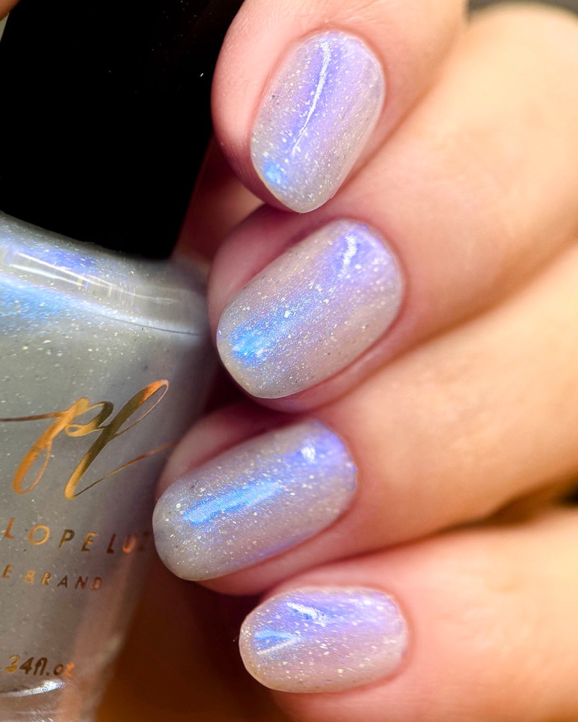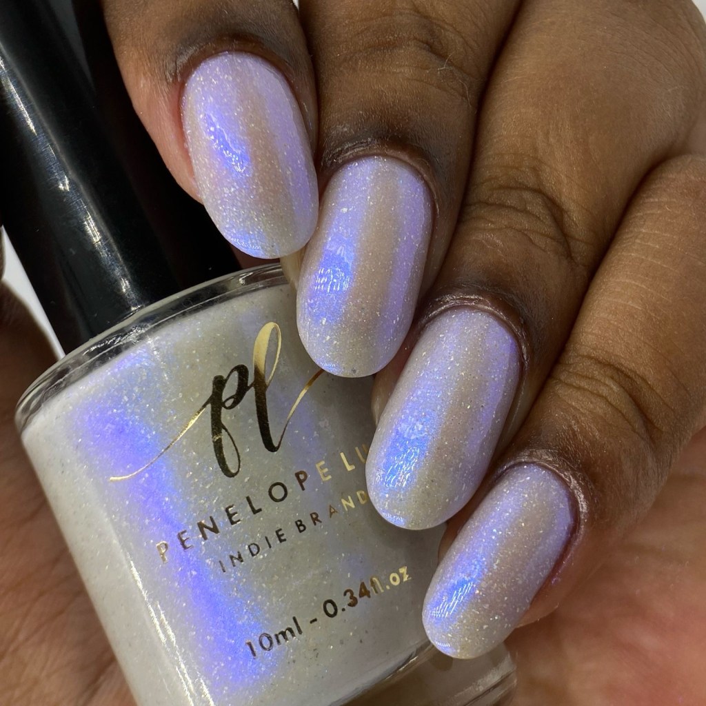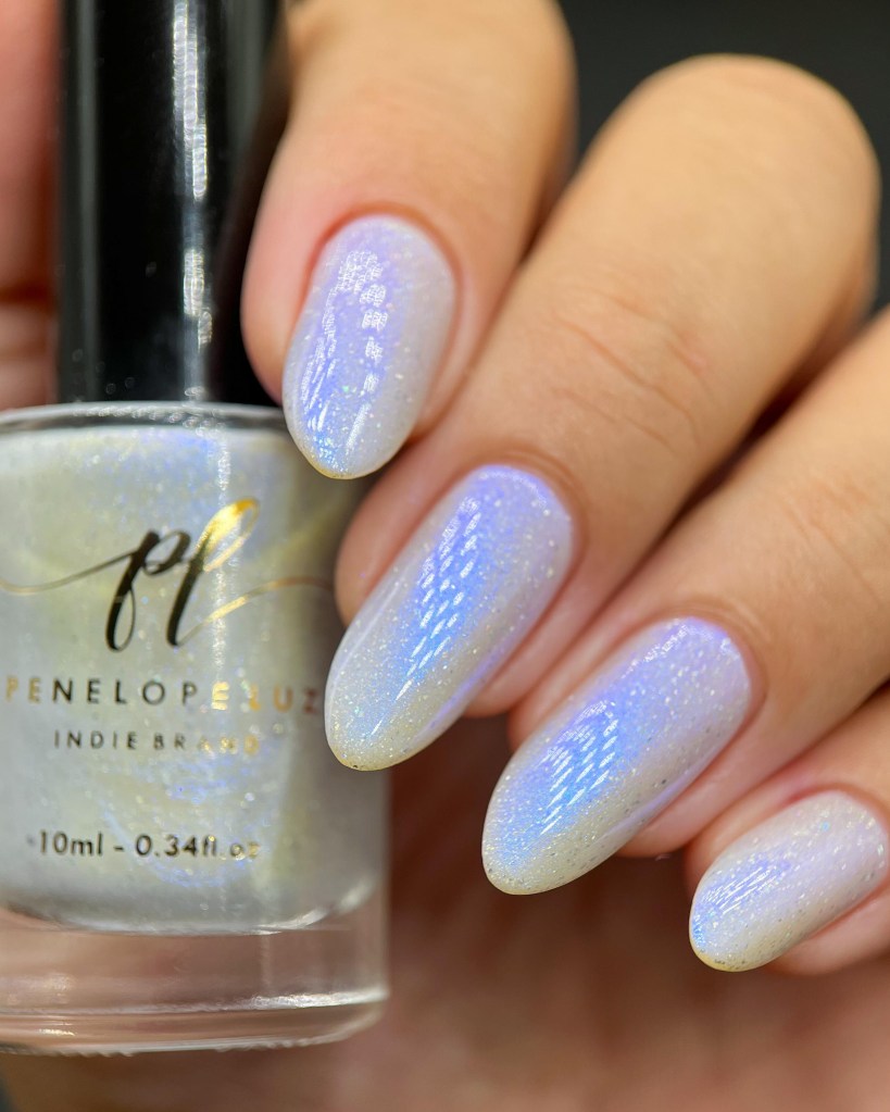 Agora vamos ao Zen Moments, branco leitoso com intenso shimmer azul/roxo pigmento holográfico e flake holográfico, inspirado nos momentos de meditação, quando tentamos quietar nossa mente e renovar nosso espírito.