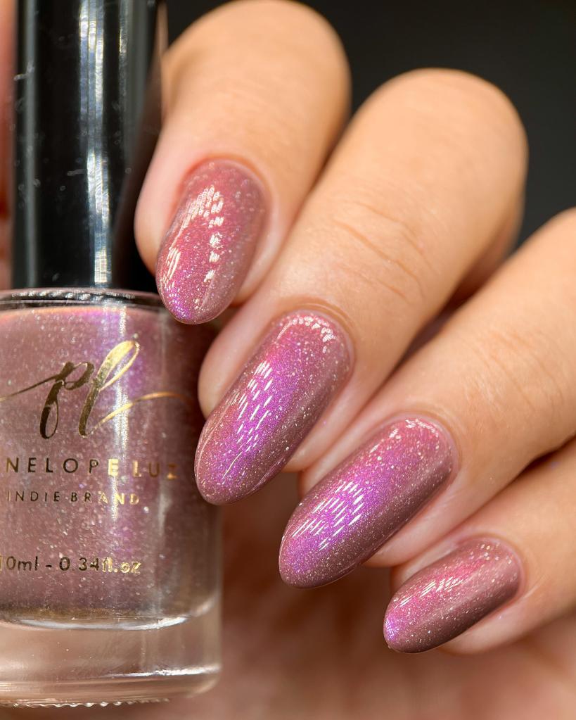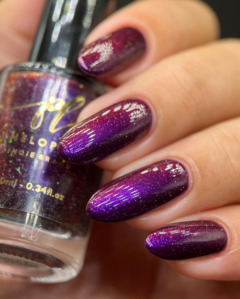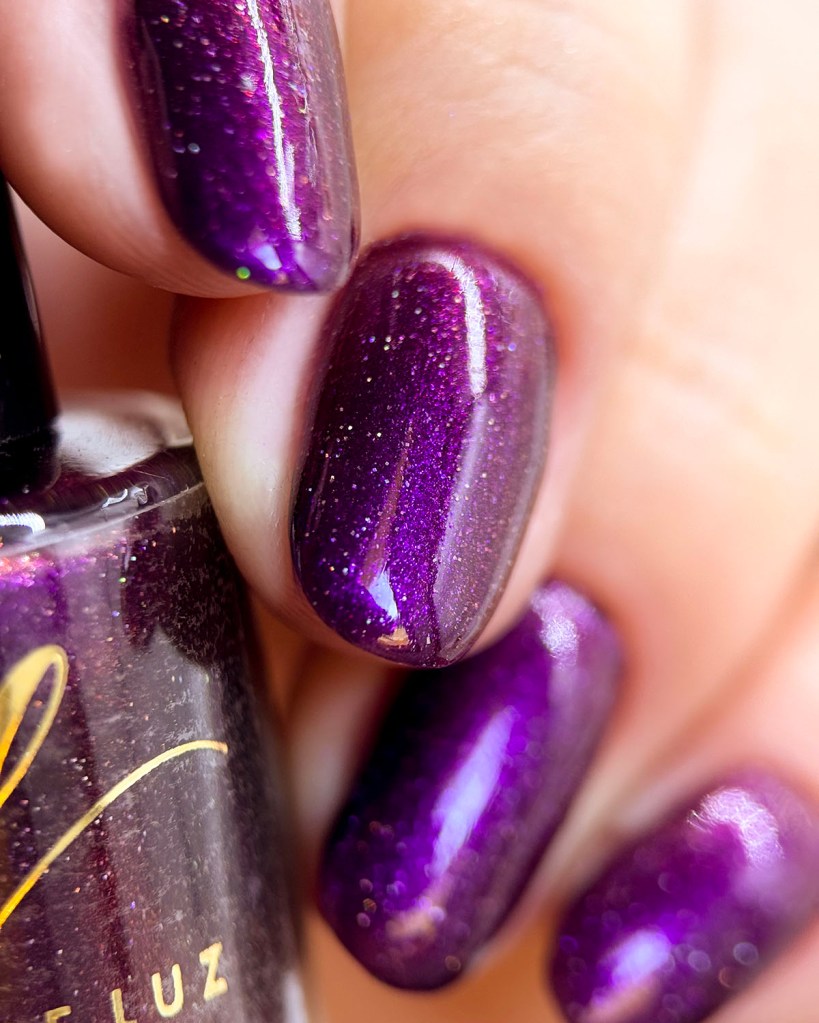 Agora vamos ao Spiritual Bliss, vinho profundo com shimmer roxo/vermelho e um pouco de glitter holo prata, inspirado na bem aventurança na alma quando começamos a conquistar nós mesmos, nosso reino interior em busca da real felicidade, aquela que só é encontrada fazendo o bem, amando e construindo um mundo melhor.